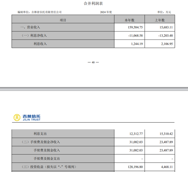 2024年,吉林信托的利息收入收缩明显,当年仅1244.19万元,较2023年的2106.95万元,下降40.59%。