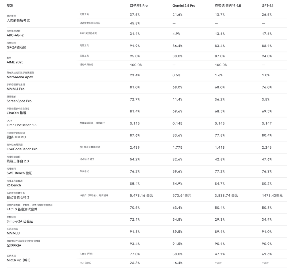 不仅如此,而谷歌又单独拎出了人类最终测试、终端工作台2.0和SimpleQA Verified三个指标加以强调,矛头直指Claude Sonnet4.5和GPT-5.1。