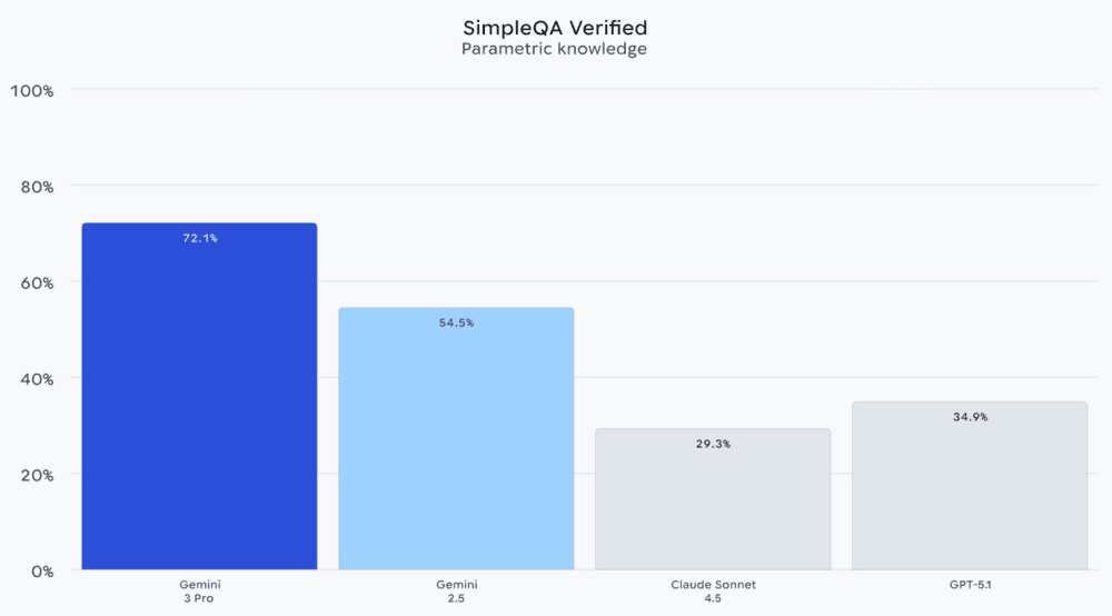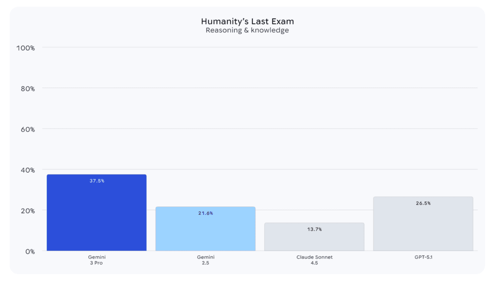 谷歌试图表达,Gemini 3 Pro 在标准化知识生成、AI工具使用乃至“人工智能”这几个重要指标方面,具有全方位的优势。