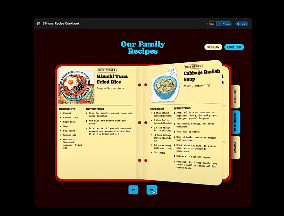 谷歌官方表示,Gemini 3 Pro 还可以翻译菜谱照片,然后将其转换成食谱;除此之外,它还可以根据一系列视频讲座创建交互式学习卡片。