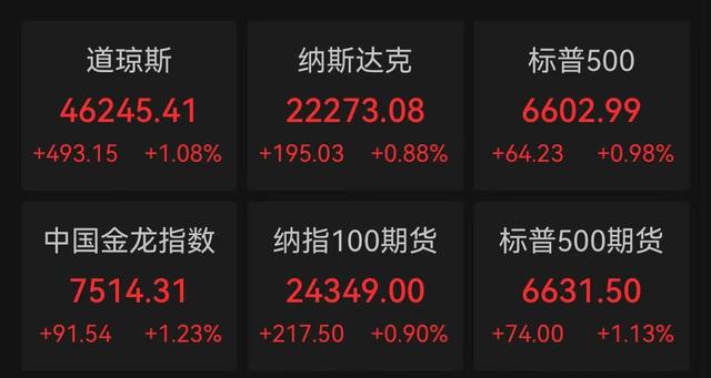 截至收盘,道指涨1.08%报46245.41点,标普500指数涨0.98%报6602.99点,纳指涨0.88%报22273.08点。本周,道指跌1.91%,标普500指数跌1.95%,纳指跌2.74%。