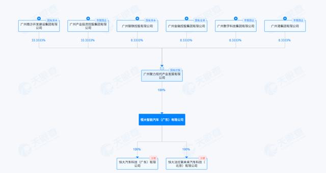 从披露的信息来看,广州聚力对恒大智能汽车(广东)有限公司的出资额为25亿元,对恒大新能源汽车(广东)有限公司的出资额为20亿元,持股比例均为100%。