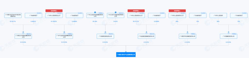 其中,广州南沙开发建设集团由广州南沙经济技术开发区管理委员会和广东省财政厅持股,持股比例分别为93.5017%和6.4983%。而广州产业投资集团由广州市人民政府办公厅和广东省财政厅分别持股91.5502%和8.4498%。