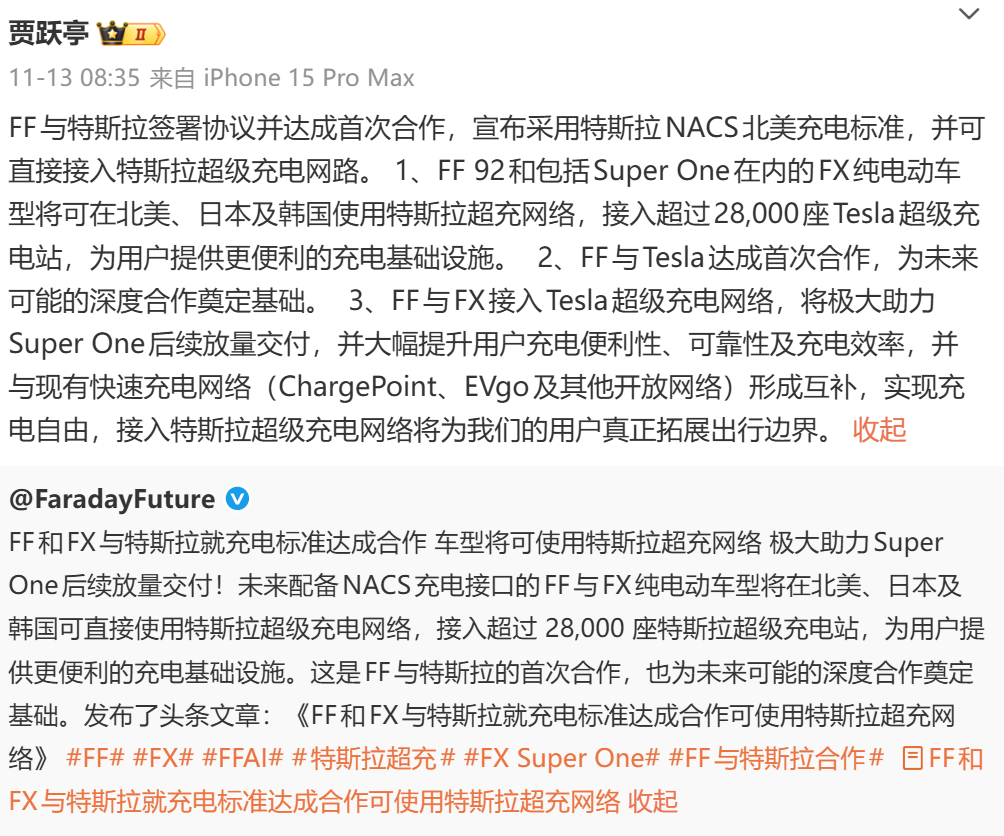 其次,法拉第未来还与特斯拉就充电网络开始了合作,听起来很厉害的感觉,我仔细查了一下,官方新闻稿说明:未来FF92与FX Super One等车型将配备NACS充电接口,从而能使用特斯拉在美、日、韩等地的超级充电网络,也就是接入超过28,000座超充站。不过,公告中并未披露对特斯拉的明确一次性付款或总投入金额。