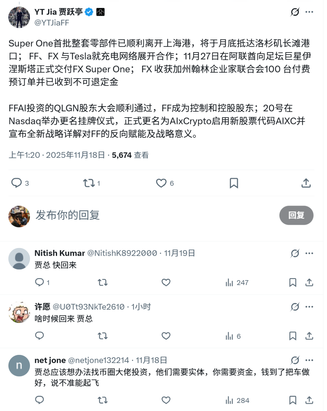 参考资料:贾跃亭微博,X账号,法拉第未来微博与X账号,富途社区,investing.com等