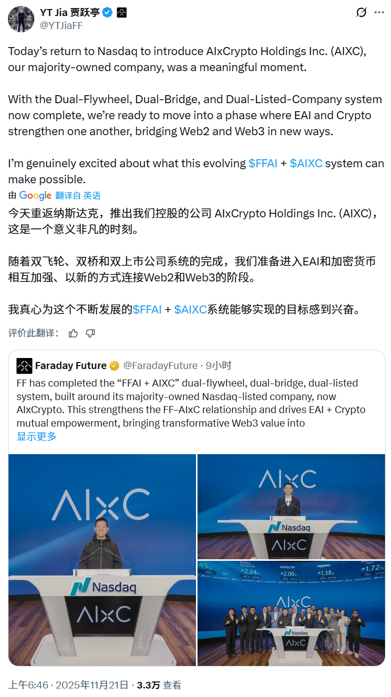 Faraday 发布新闻稿称已完成“FFAI + AIXC 双飞轮、双桥、双上市”体制的形成,且 AIxCrypto 被表述为“其控股的加密公司/子公司”。