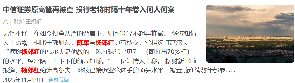 据今日消息,多位知情人士向财新透露,陈军与在证监会工作了近20年的杨郊红私交甚密,经常约着一起打高尔夫。