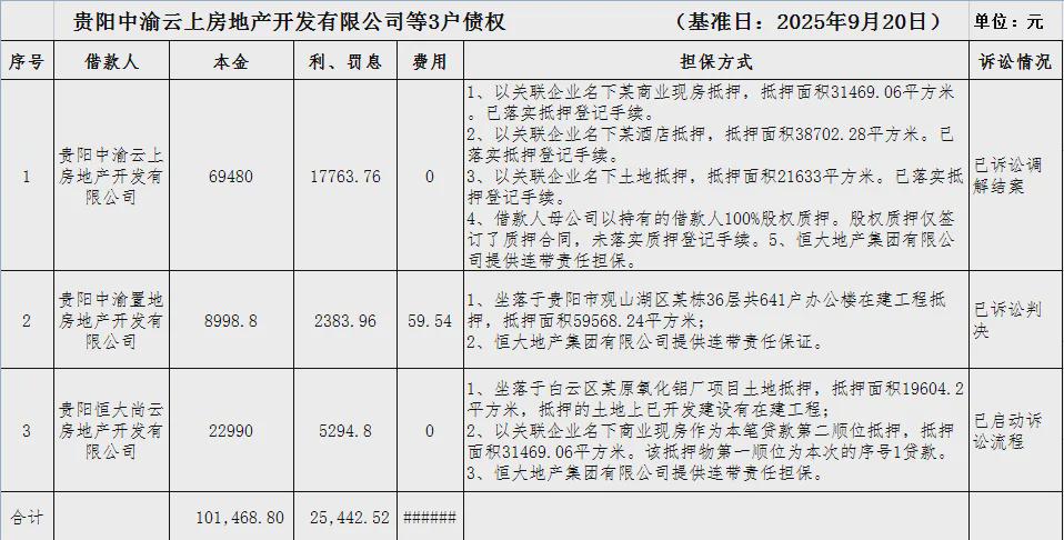 其中,涉及贵阳中渝云上借款本金6.95亿元,利息及罚息总计1.77亿元;涉及贵阳中渝置地借款本金近0.9亿元,利息及罚息合计约2384万元;涉及贵阳恒大尚云借款本金约2.3亿元,利息及罚息合计5294.8万元。