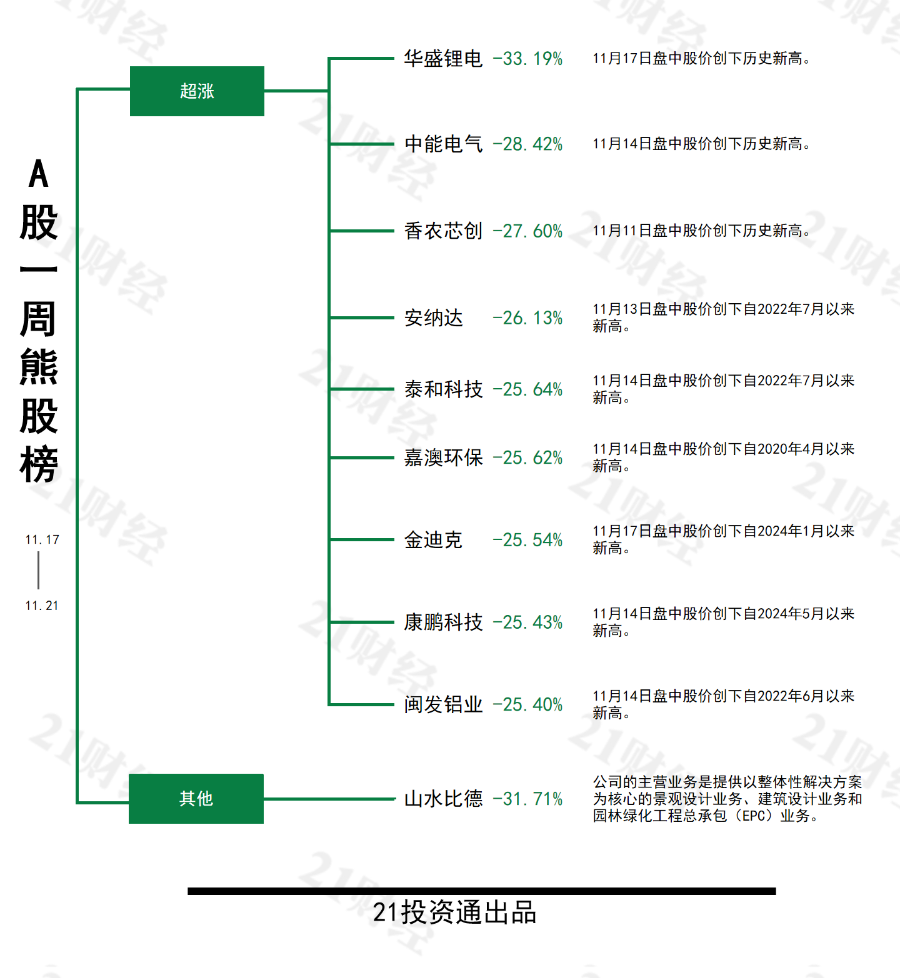 本期十大熊股中,华盛锂电(688353.SH)以33.19%的跌幅成为本期的最熊股。山水比德(300844.SZ)、中能电气(300062.SZ)、香农芯创(300475.SZ)、安纳达(002136.SZ)等股的周跌幅均在26%以上。本期熊股榜十只个股过去一周累计跌幅均超过34%,其中多只个股均在上周突破了阶段性新高。