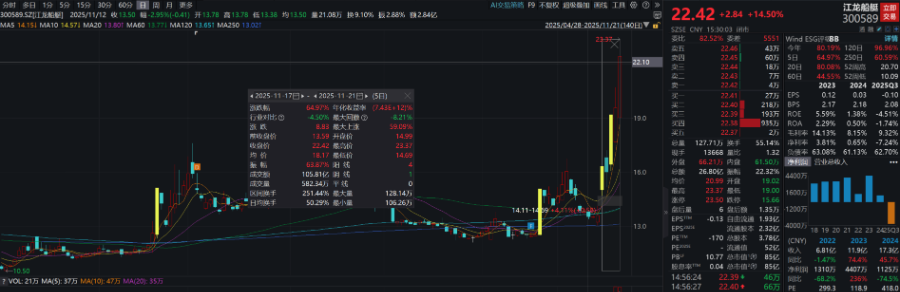 二级市场方面,自11月17日起,本周公司股价持续走高收获5天2板,截至11月22日,股价报22.42元/股,总市值约85亿元。