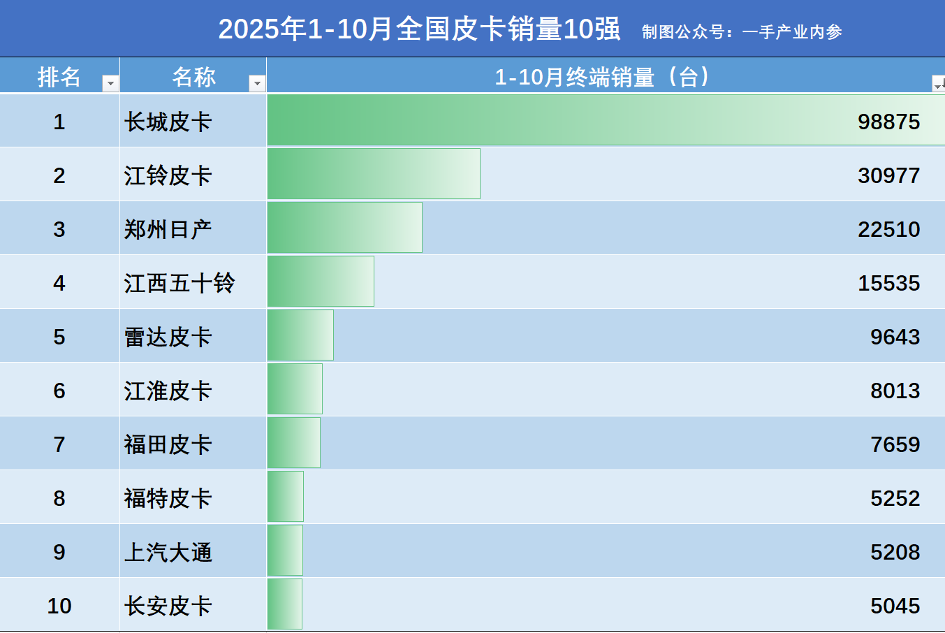 另附:2025年1-10月国内皮卡销量10强厂商名单,数据源于:中国皮卡网。