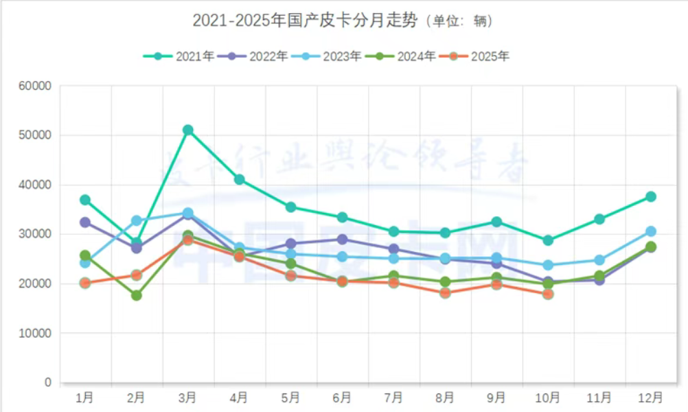 中国皮卡网数据显示,2025年1-10月国产皮卡累计终端销量(不含专用车和出口)为21.38万辆,同比下滑了5.5%,(注:同期皮卡出口量为25.4万辆)。