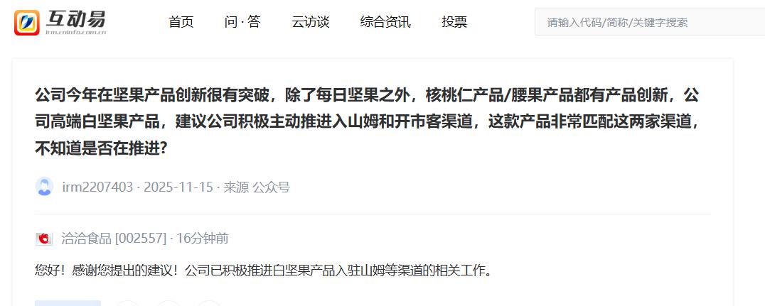 【V观财报丨洽洽食品:已积极推进白坚果产品入驻山姆等渠道】洽洽食品23日通过深交所互动易平台回答投资者提问称,公司已积极推进白坚果产品入驻山姆等渠道的相关工作。(中新经纬APP)