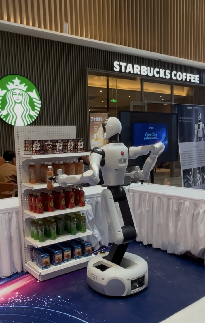 4、在银河通用的小卖铺里选好商品扫码下单后,Galbot就会自行去货架抓取商品,没有遥控,没有预设,饮料零食都能稳稳拿下,中途还会夸我真有眼光,它也最喜欢奥利奥可可酥了。