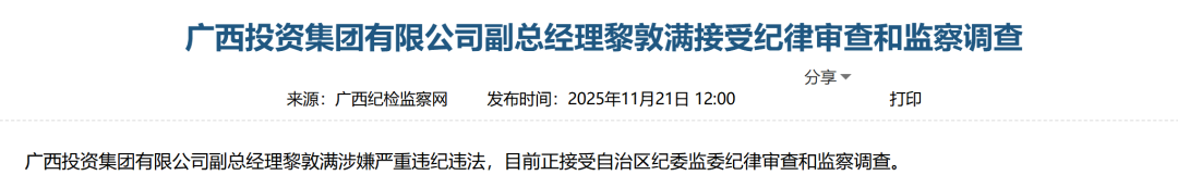 2025年11月21日,广西纪委监委宣布,广西投资集团有限公司副总经理黎敦满涉嫌严重违纪违法,目前正接受自治区纪委监委纪律审查和监察调查。
