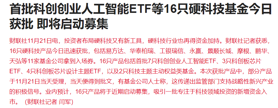 在近期科创指数大幅调整后,首批科创创业人工智能ETF等16只硬科技基金于11月21日获批 ,即将启动募集。