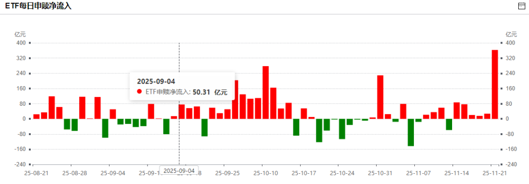 虽然近期A股连续调整,资金却展现出逆势布局的态势,借道股票型ETF“越跌越买”。Wind数据显示,11月21日当日,全市场1263只可统计的股票型ETF净流入金额高达407.55亿元,全周累计净流入规模达701.21亿元。