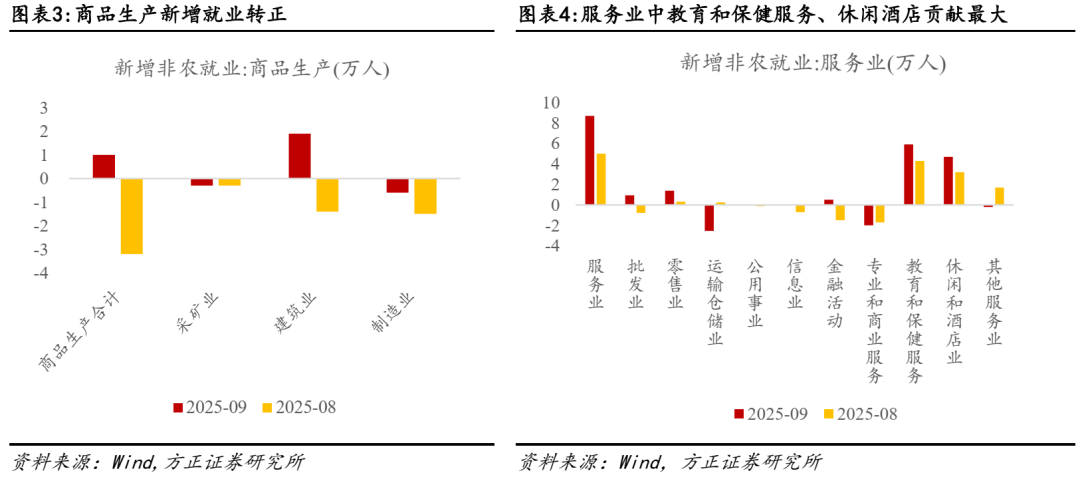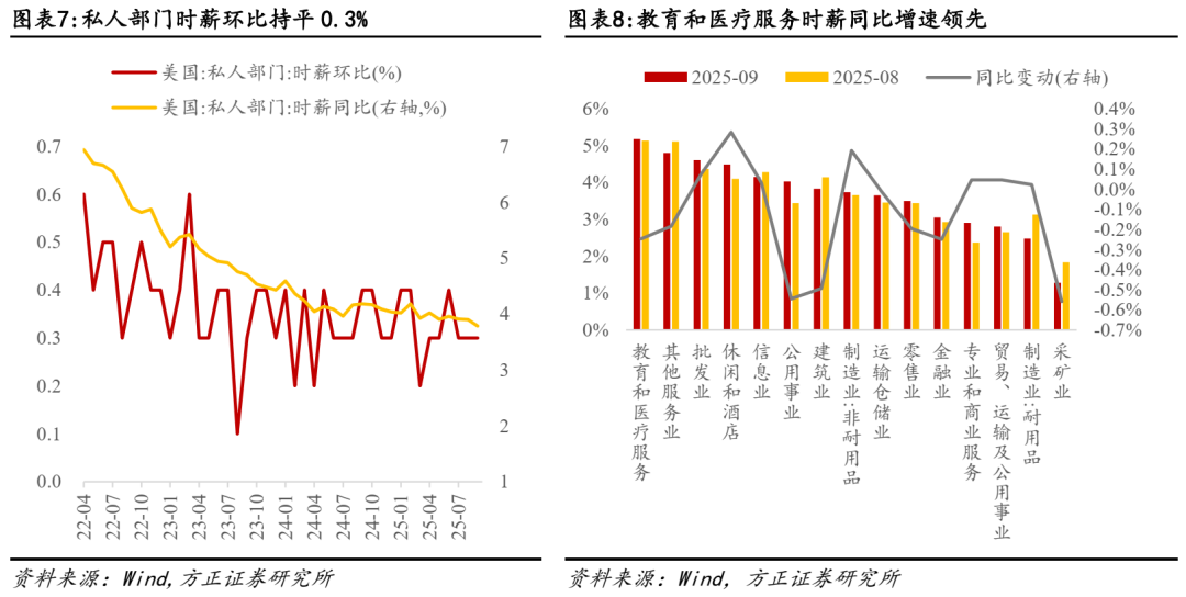 9月数据略有滞后,但超预期反映就业市场此前的大幅下行趋势边际收敛:7月开始的非农数据呈现持续走弱趋势,其中私人部门走弱尤为明显。但9月数据边际走强,意味着此前美国劳动力市场大幅下行的压力相对有限。但10月开始政府关门对就业市场的负向冲击体现,因此暂不能得出美国就业市场边际反转结论,结合失业率、工资增速等看,大概率延续温和下行态势。