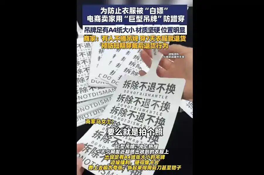 例如,最近有网友晒出收到的衣服,挂着堪比A4纸大小的“巨型吊牌”,且材质坚硬,层层叠叠。如果要穿出去就必须剪断吊牌,而剪断吊牌就不能退货。