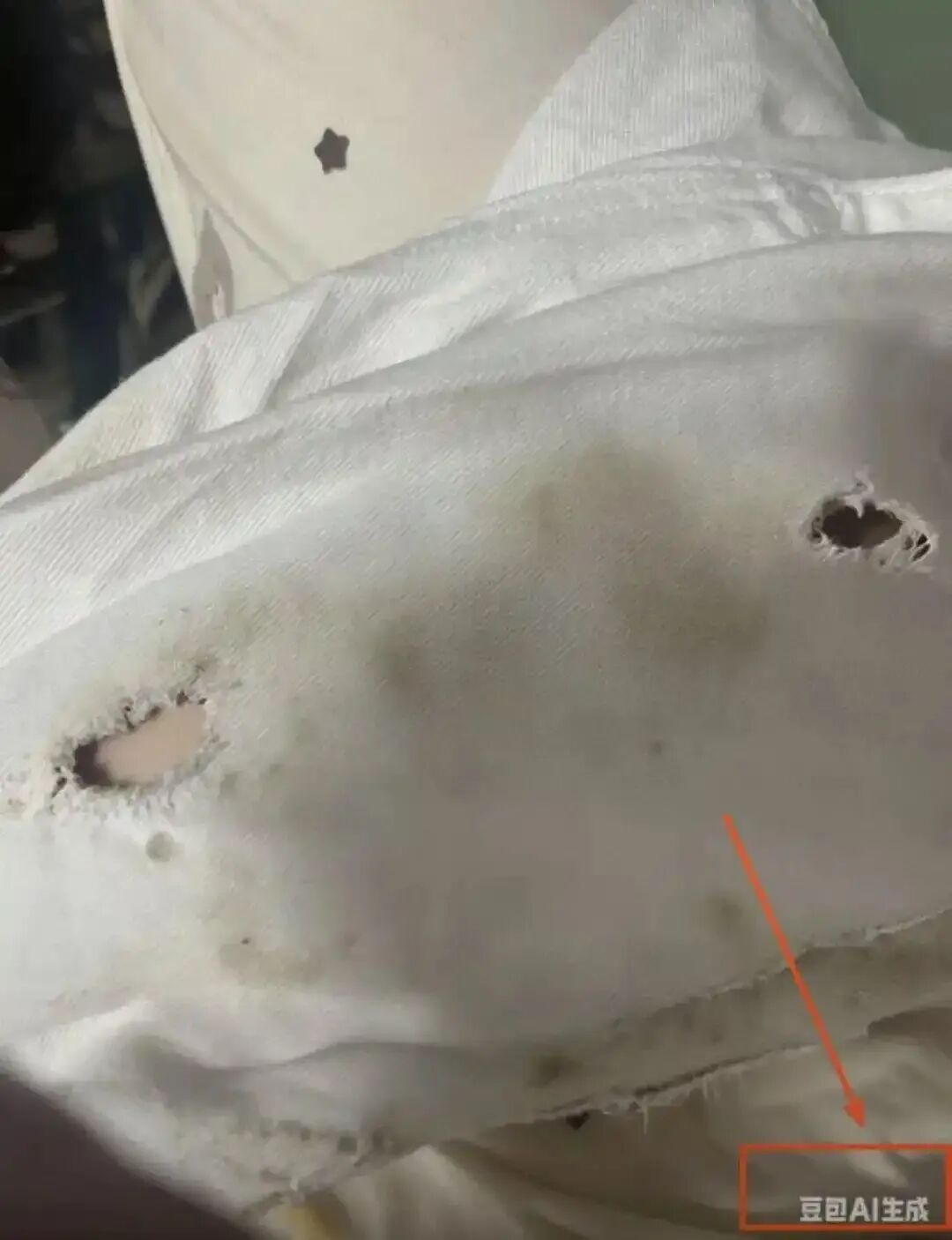 “顾客发给我一张商品瑕疵图,说收到就这样了。好家伙,那AI水印还在下面带着呢。”一名商家发出一张衣物破损和沾有污渍的图片,而图片右下角还带着“AI生成”的水印。