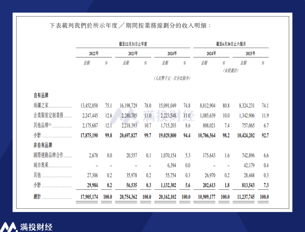 主品牌依赖:70%收入占比下的增长乏力。海澜之家虽试图打造多品牌矩阵,如轻奢女装OVV、高端婴童品牌英氏、潮流男装黑鲸,但营收仍高度依赖主品牌“海澜之家”。2022—2024年及2025年前三季度,主品牌营收占比始终超过70%,2024年主品牌营收同比下滑近7%,2025年前三季度同比再降近4%。