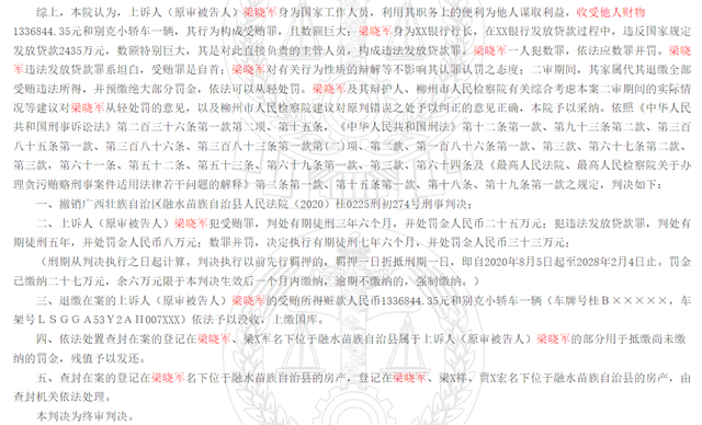 梁晓军因无视中央八项规定精神,接受管理服务对象的旅游安排;把贷款审批权力作为谋取个人利益的筹码,利用职务之便为他人谋利,收受他人财物133.68万及别克小轿车一辆,构成职务违法并涉嫌犯罪,数罪并罚。二审决定对梁晓军执行有期徒刑7年6个月,并处罚金人民币33万元。