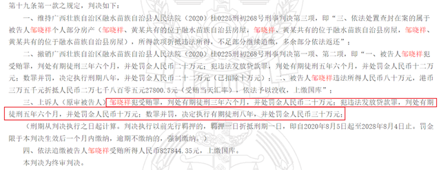 经历了一审、二审后,最终法院审理认为,邹晓祥身为国家工作人员,利用其职务上的便利为他人谋取利益,收受他人财物82.78万元,其行为构成受贿罪,且数额巨大;邹晓祥身为广西融水柳银村镇银行董事长,在发放贷款过程中,违反国家规定发放贷款2435万元,数额特别巨大,其是对此直接负责的主管人员,构成违法发放贷款罪。邹晓祥一人犯数罪,依法应数罪并罚。决定执行有期徒刑8年,并处罚金人民币30万元。