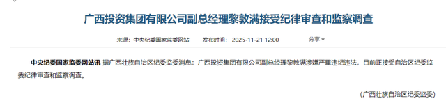 11月21日,广西壮族自治区纪委监委通报,广西投资集团有限公司(下称“广西投资集团”)副总经理黎敦满涉嫌严重违纪违法,正接受纪律审查和监察调查。