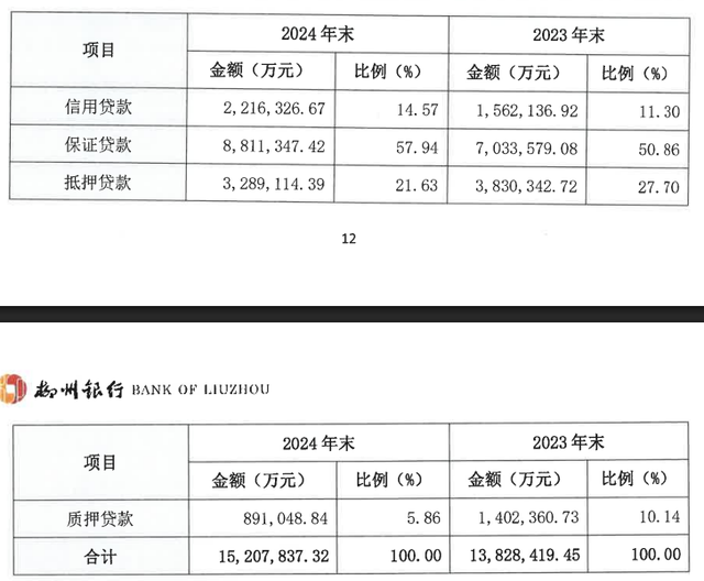从贷款结构来看,2024年末抵押贷款规模由27.7%降至21.63%,质押贷款规模由10.14%降至5.86%,与此同时,保证贷款和信用贷款规模占比均上升,虽然符合政策鼓励方向,但对银行的风险识别与管控能力提出了更高要求。