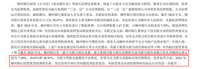 同时,柳州银行关联交易及客户集中度指标亟待压降。根据联合资信评级发布的柳州银行2025年跟踪评级报告显示,截至2024年末,柳州银行单一最大关联方授信余额、最大集团关联方授信余额和全部关联方授信余额占资本净额的比重分别为7.49%、18.63%和 48.93%,关联方贷款无逾期及不良情况,但需关注关联交易指标后续压降情况。