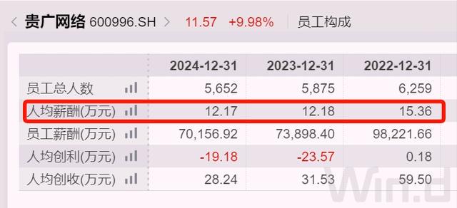 至2024年末,贵广网络职工总数超过5600人,去年人均税前薪酬12.2万元,和2023年基本持平,比2022年少3万多元,毕竟企业在持续亏损。