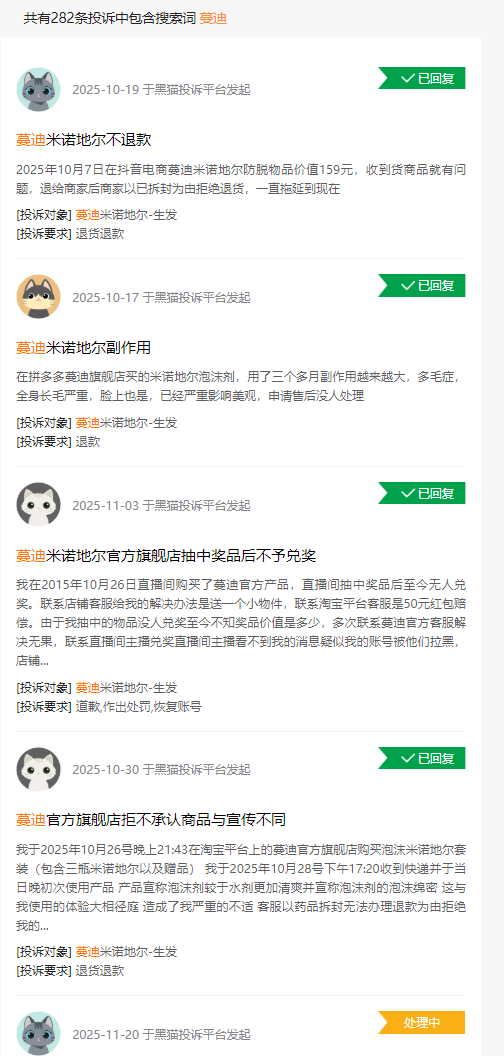 猫姐看了一下黑猫投诉关于蔓迪米诺地尔的相关投诉,有282条。