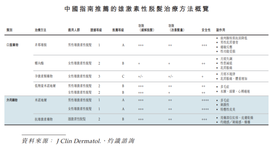 按照中国雄激素性脱发指南, 药物治疗主要有三种,分别是米诺地尔、非那雄胺及螺内酯。