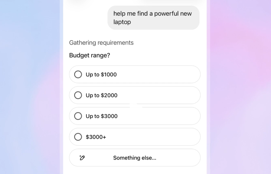 AI不会立即生成文本回复,而是会以问答形式征求更多信息,例如预算、颜色偏好和商品尺寸等。