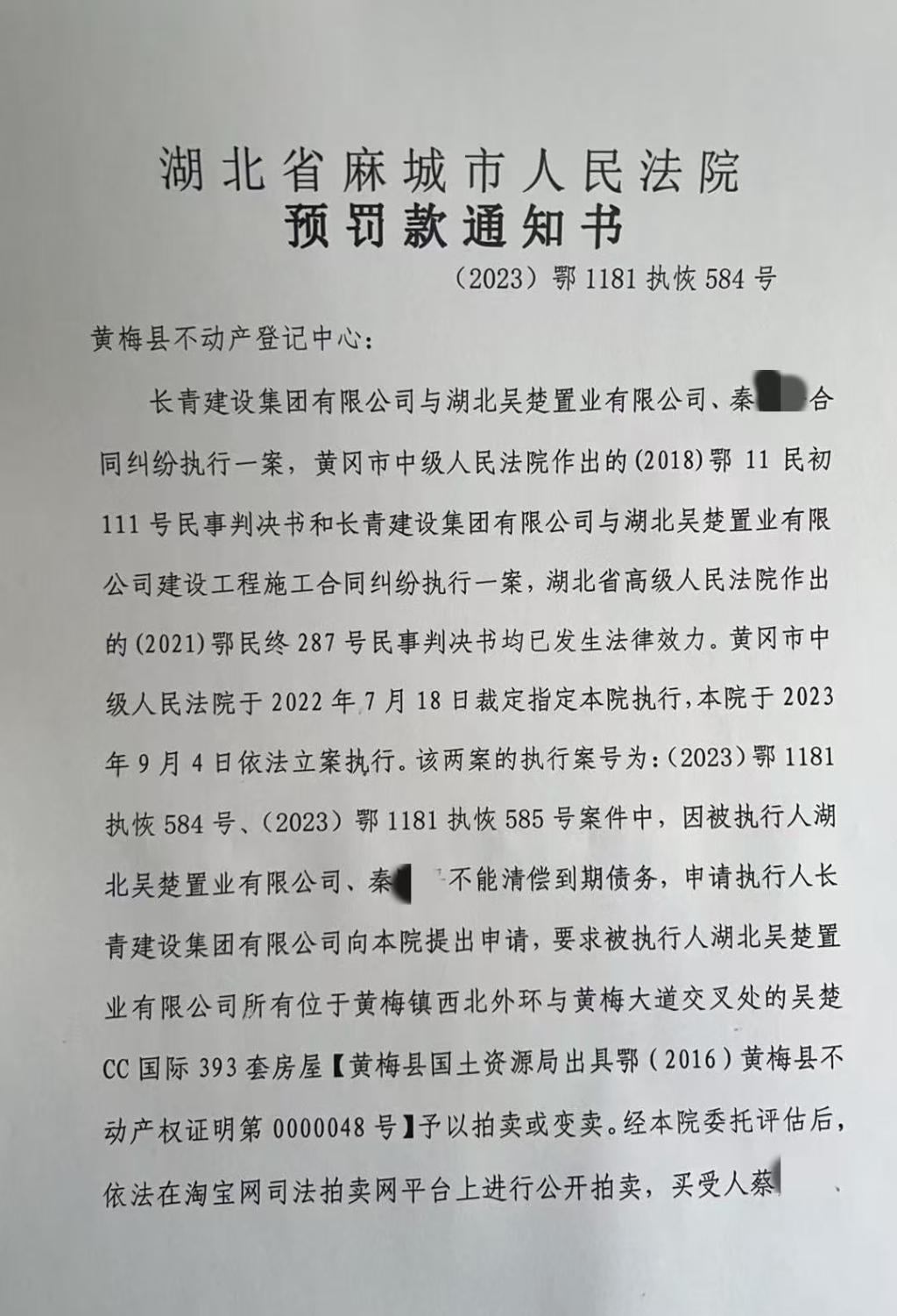 11月17日,麻城市法院向黄梅县不动产登记中心作出《预罚款通知书》,称麻城市法院于2024年4月向黄梅县不动产登记中心送达了房产解封及协助过户的《协助执行通知书》,黄梅县不动产登记中心在规定期限内未按照协助通知书履行义务,预对黄梅县不动产登记中心处以五万以上一百万以下的罚款。