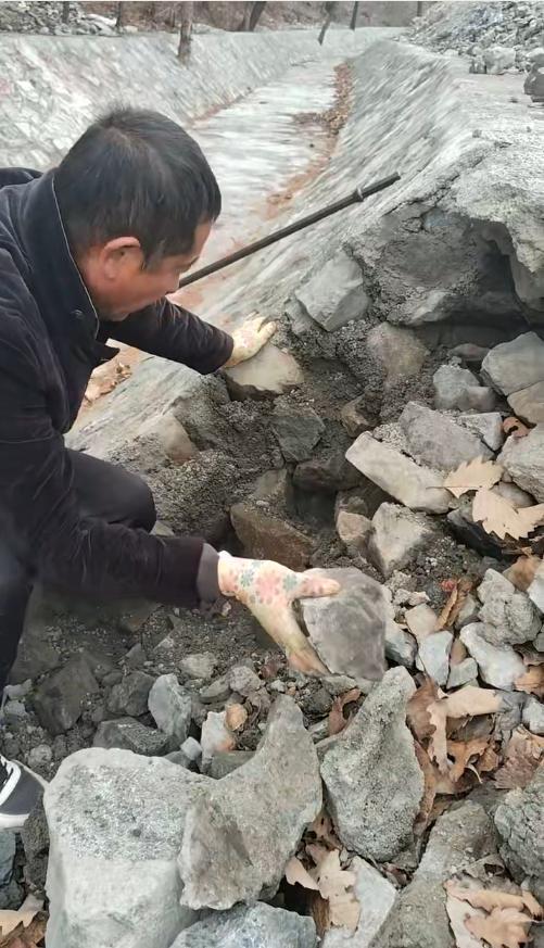 视频中,一名男子在一处水渠处,扒拉工程内浇筑的砂浆、石块等。石块一掰就掉,砂浆一抠就碎。男子说,“几个月了,水渠的挡墙上,石块一掰就下来了。先不说工程是不是合格的,水泥一抠就开了,这合格吗?”