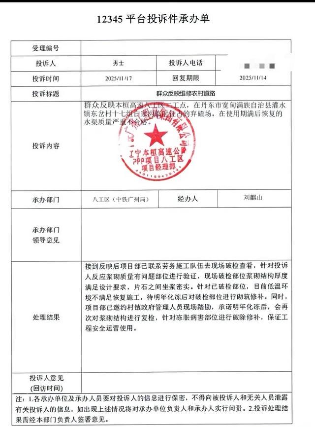 11月23日,视频发布者晒出一张《12345平台投诉件承办单》显示,群众反映本桓高速八工区二工点,辽宁省丹东市宽甸满族自治县灌水镇东岔村十七组白家沟临时征占的废渣场。在试用期满后,恢复的水渠质量严重不合格。