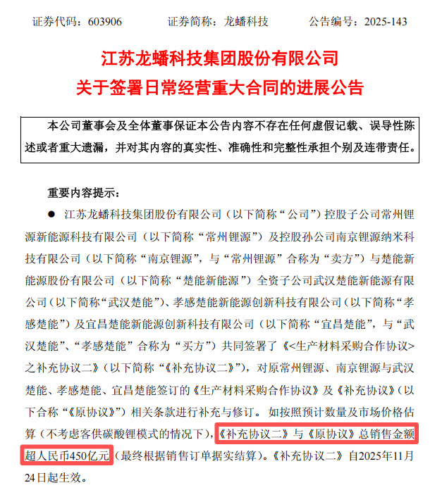 11月24日晚间,龙蟠科技发布公告称,公司对楚能新能源股份有限公司(以下简称楚能新能源)的总销售金额,预计从此前超50亿元变为超450亿元。