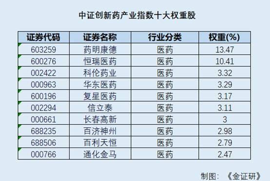 此外,从成份股来看,中证创新药指数权重包括恒瑞医药、药明康德、百济神州、复星医药、华东医药、长春高新等研发实力强劲、高成长性的行业龙头,覆盖创新药研发、CXO、生物药等多个细分领域。且前指数十大成份股权重47.45%,较高的成份股集中度也赋予指数较突出的锐度和弹性。