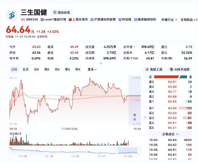 截至2025年11月24日,三生国健报收64.64元/股,总市值399亿元。