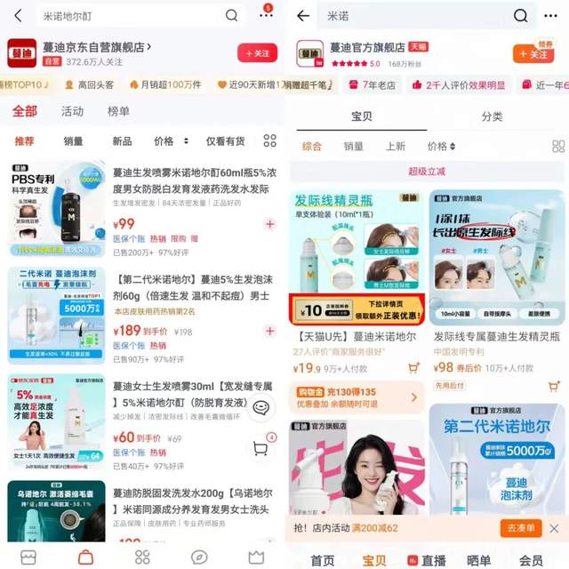 蔓迪国际如今真正的增长引擎,是2024年推出的米诺地尔泡沫剂。在淘宝上,蔓迪官方旗舰店有167.6万粉丝,京东上的自营旗舰店则有372.6万粉丝。淘宝和京东上,蔓迪销量第一的产品均是生发泡沫剂。