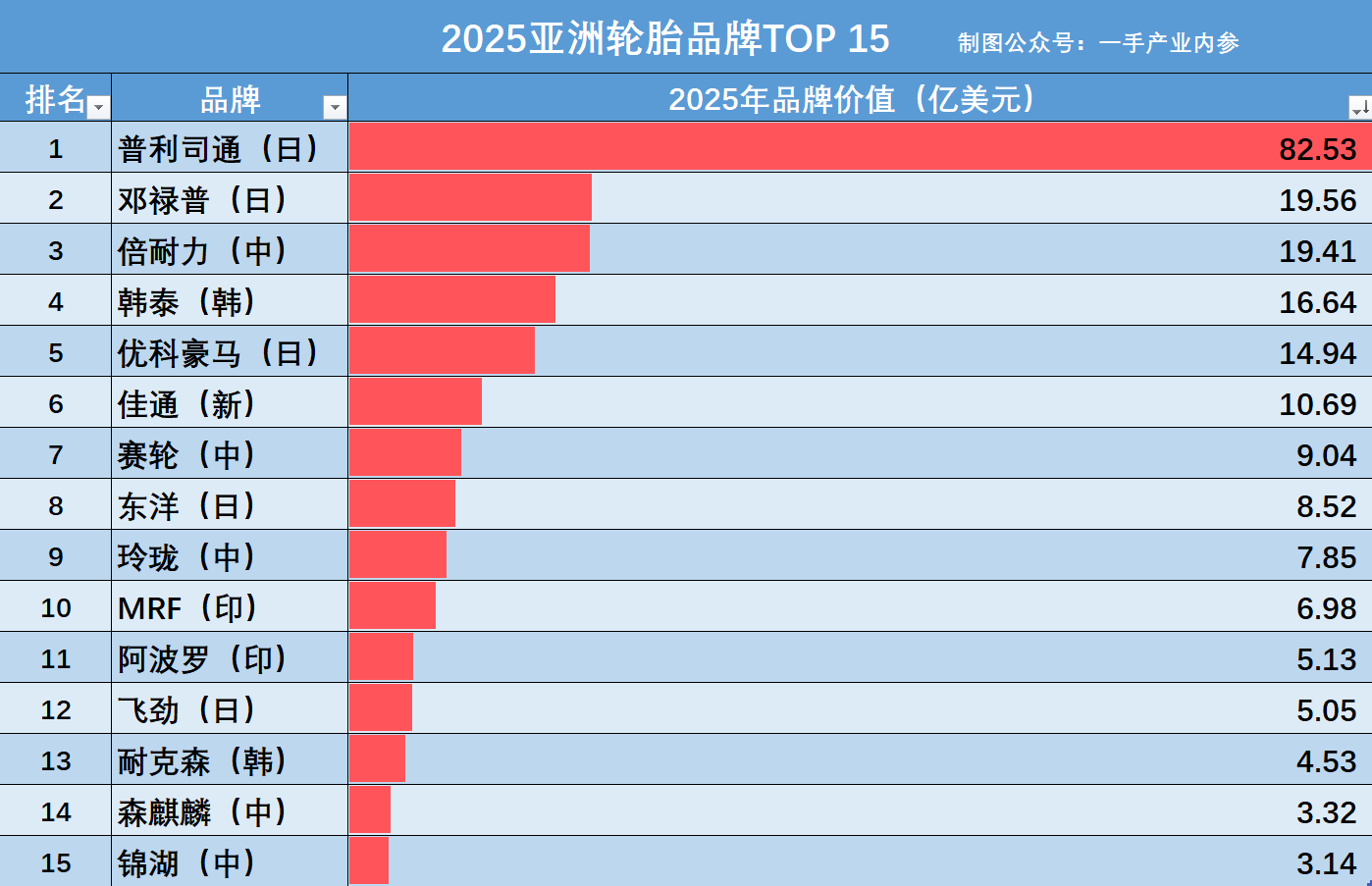 另附:2025年度亚洲轮胎品牌15强,数据源于:Brand Finance。