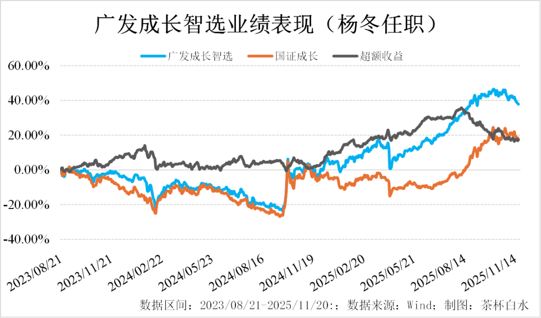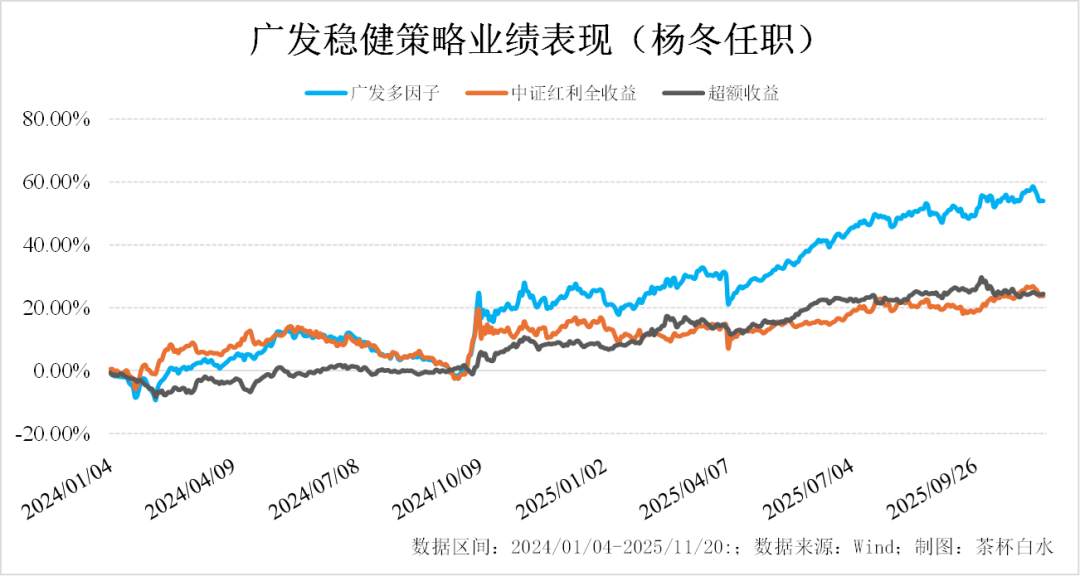 先介绍广发稳健策略,杨冬自2024年1月4日接手管理,主要对标中证红利指数。截至今年11月20日,任职回报达53.94%,同期业绩基准为23.29%,中证红利全收益为24.45%,超额收益稳健且持续。