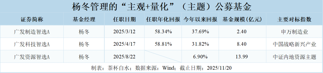 对于主题增强类产品而言,杨冬团队在今年陆续发行了制造智选、科技智选和资源智选三只“智选”系列产品,分别对标申万制造指数、中证新兴成指和内地资源指数。