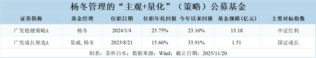 具体来看,杨冬管理的策略类产品包括广发稳健策略(006780)和广发成长智选(002802),业绩基准分别主要对标中证红利和国证1000成长指数。