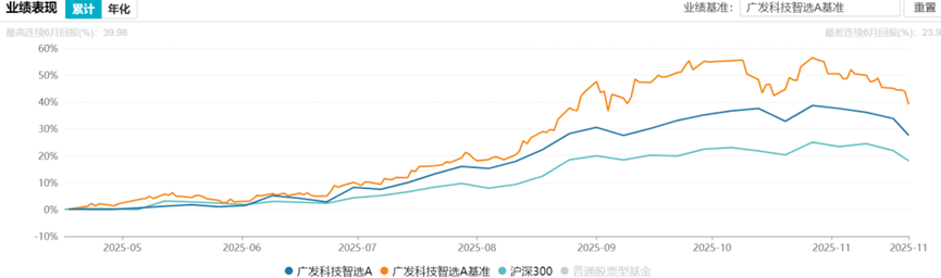 广发科技智选(023647)于今年4月17日成立,成立至11月21日的收益为27.57%,基准收益为39.02%,略微跑输基准。