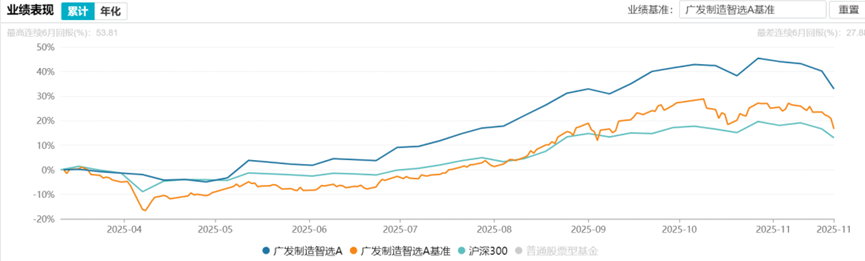 广发制造智选(023524)于今年3月12日成立,截至11月21日的收益率达32.94%,同期业绩比较基准为16.64%,实现了16.30%的超额收益,表现相当亮眼。