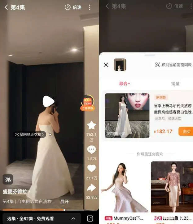 有记者在测试时发现,当红果播放《盛夏芬德拉》 《好一个乖乖女》等热门作品时,倘若用户暂停观看,系统便会自动识别演员服装、饰品等并弹窗推荐。除此以外,用户也可以点击APP右上角的“识图搜同款”来主动定向对应的服装、家具、配饰等。