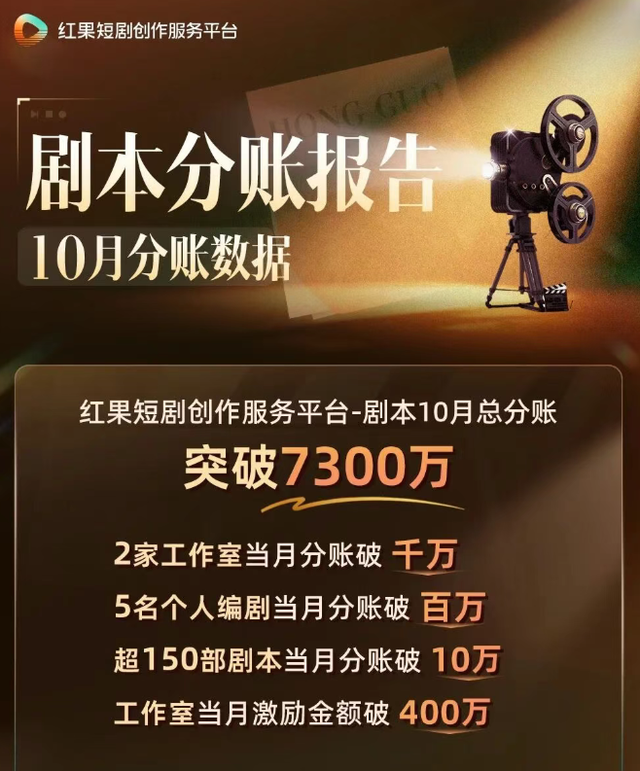 相关报道指出,除充当信息分享媒介外,运营账号的“红果短剧创作服务平台”本体也将整合剧本、演员、制作等资源,并向不同的角色提供分账激励、项目匹配、数据复盘等全流程服务。就收入能力而言,其公众号发布的“剧本分账报告,10月分账数据”则显示: