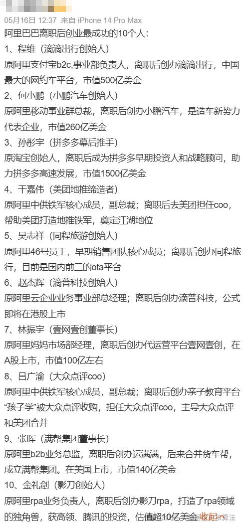 这些年,阿里巴巴走出了不少商界精英,网上有人列出了从阿里巴巴离职创业成功的十位大佬,分别是滴滴出行创始人程维、小鹏汽车创始人何小鹏、拼多多幕后推手孙彤宇、美团地推缔造者干嘉伟、同程旅游创始人吴志祥、滴普科技创始人赵杰辉、壹网壹创董事长林振宇、大众点评COO吕广渝、满帮集团董事长张晖、影刀创始人金礼剑。